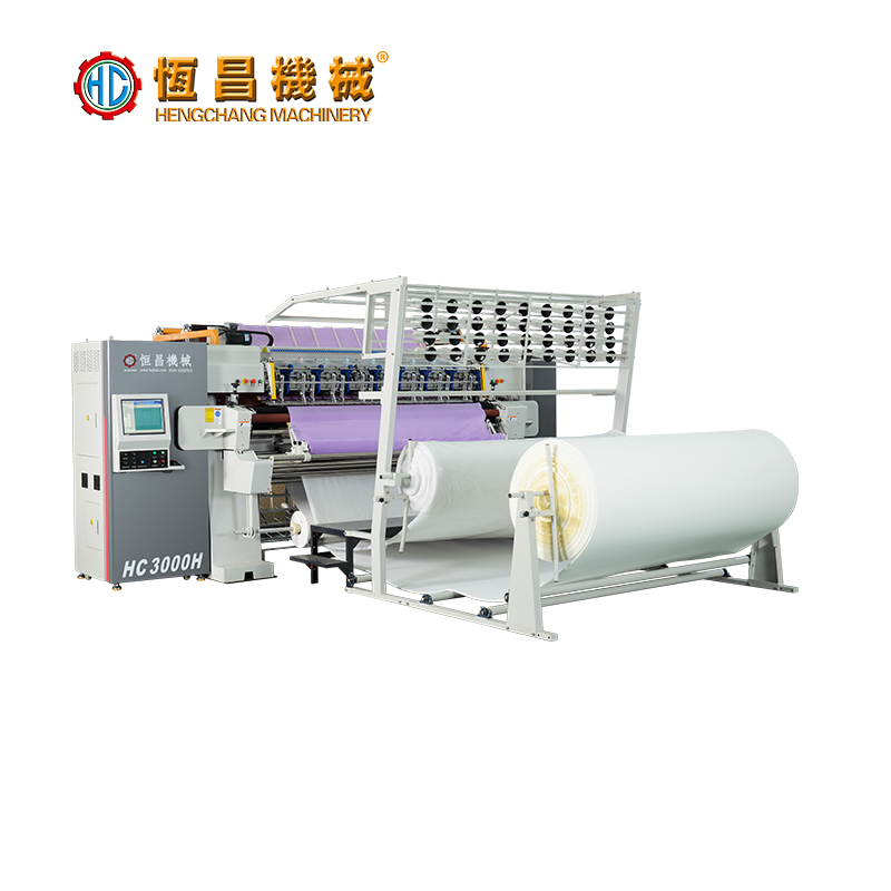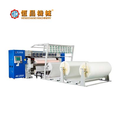 HC-3300 新款电脑无梭多针绗缝机(带刀分条可选) 电箱整机一体化,简化安装流程,接上总电就能启动 针排压板杆采用双臂连接 Y轴转动改用涡轮减速齿轮箱,X轴用丝杆加真线导轨辅助 移动架料斗改双直线导轨